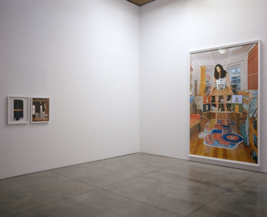 With a series of photographs entitled Inhabit, Antoni turns her attention to the complex role of mothering. After years of exploring her relationship to her family, most specifically her mother, Antoni now focuses on herself in this role. In her daughter's room, Antoni creates a series of situations that repeat at different scales, with slightly different protagonists and a myriad of cross–references. She hangs off the architecture, suspended by a web of ropes, in a harness. Her legs intersect with a fully furnished doll's house, in whose kitchen a spider has taken up residency. For Antoni, "the substitution of house for skirt allows the mother to wear the family drama."
